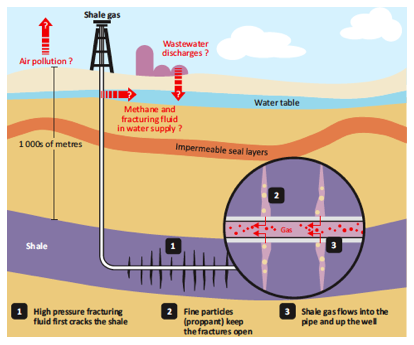 One of the best sources of factual information on hydraulic fracturing in plain English is the IEA’s “Golden Rules” report. The above diagram from that report shows the essence of the technology and its environmental risks. One of those risks is excess methane and other volatiles released to the air unless wells are capped from the outset. Doing this increases the energy yield too.